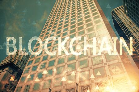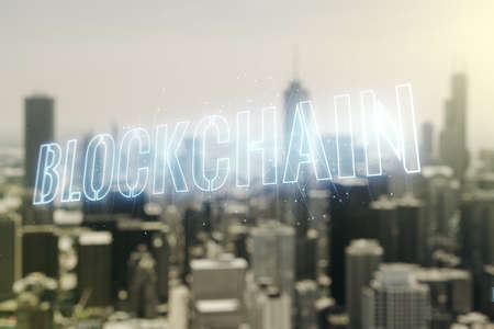 Abstract virtual blockchain technology hologram on blurry skyscrapers background, cryptography and decentralization concept. Multi exposure