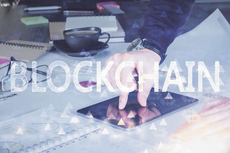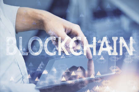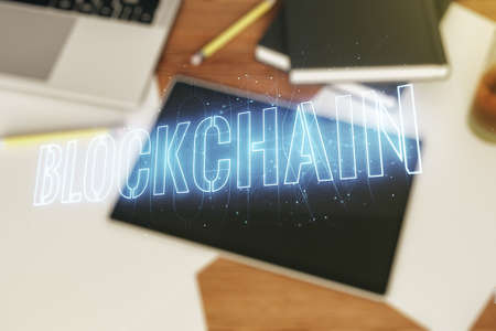 Creative abstract blockchain technology hologram and modern digital tablet on desktop on background, top view, cryptography and decentralization concept. Multi exposure