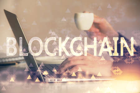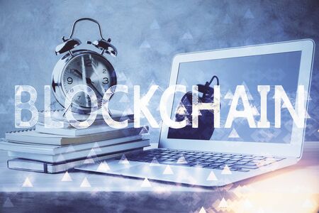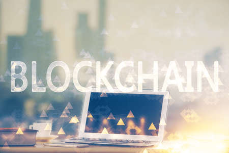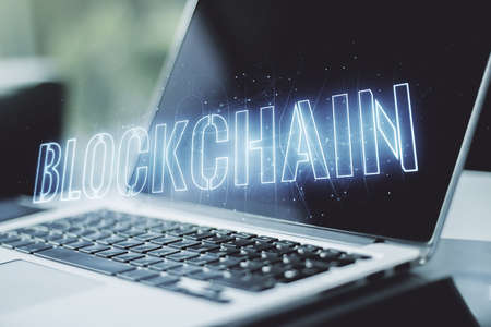 Creative concept of blockchain technology on modern laptop background. digital money transfers and decentralization concept. Multiexposure