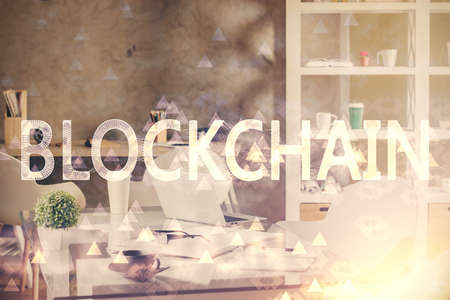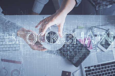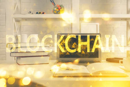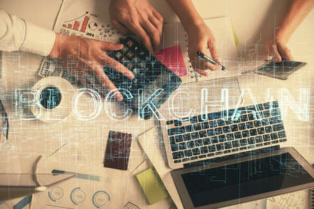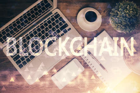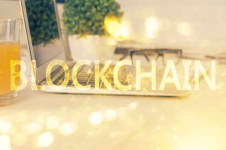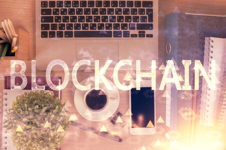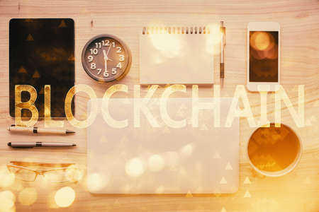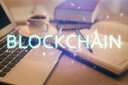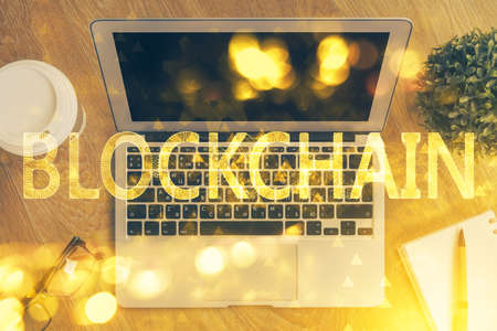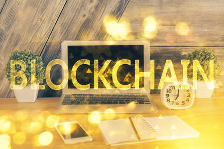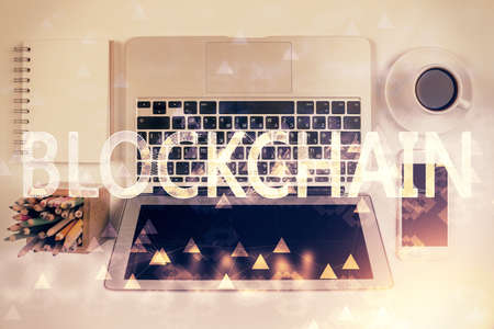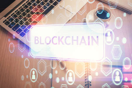 Blockchain theme hologram drawings over computer on the desktop background. Top view. Double exposure.