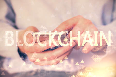 Double exposure of blockchain business sketch hologram and woman holding and using a mobile device.