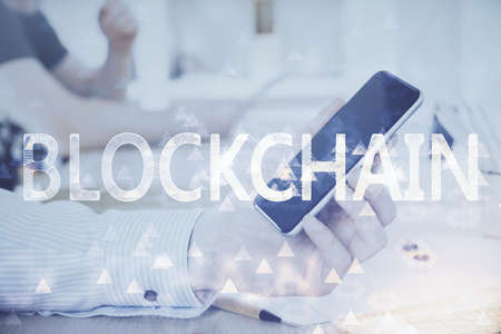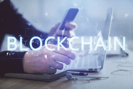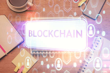 Double exposure of blockchain theme hologram over table with phone. Top view. Crypto technology concept.