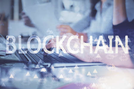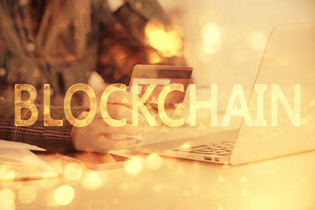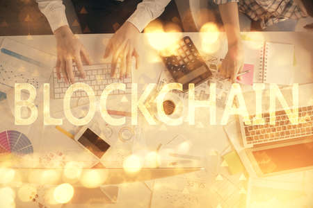 Double exposure of woman hands working on computer and blockchain theme hologram drawing. Top View. bitcoin cryptocurrency concept.