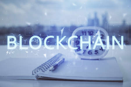 Double exposure of blockchain theme drawings and desk with open notebook background. Concept of Crypto currency