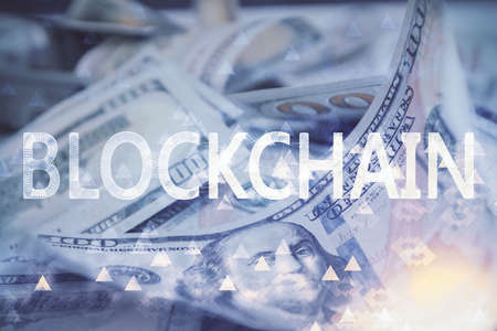 Multi exposure of crypto theme drawing over us dollars bill background. Concept of blockchain success.