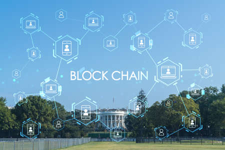 The White House on sunny day, Washington DC, USA. Executive branch. President administration. Decentralized economy. Blockchain, cryptography and cryptocurrency concept, hologram