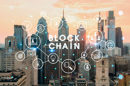 Aerial panoramic skyline of Philadelphia financial downtown, Pennsylvania, USA. City Hall Clock Tower at sunset. Decentralized economy. Blockchain, cryptocurrency and cryptography concept, hologram