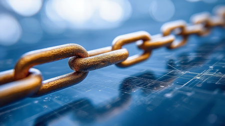 Golden Metallic Chain Links on a Blue Abstract Background Symbolizing Data Protection and Security