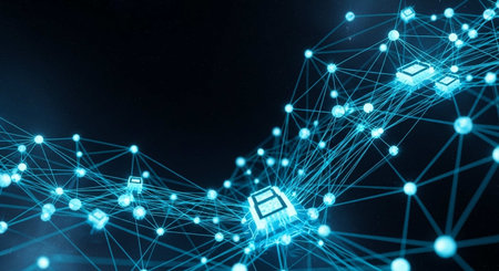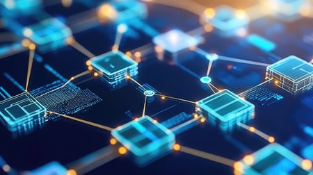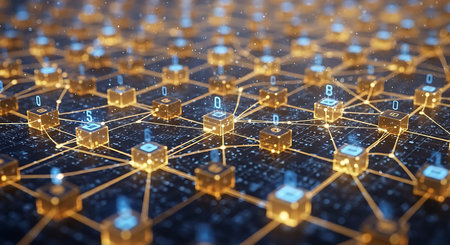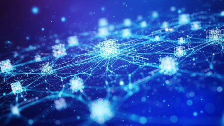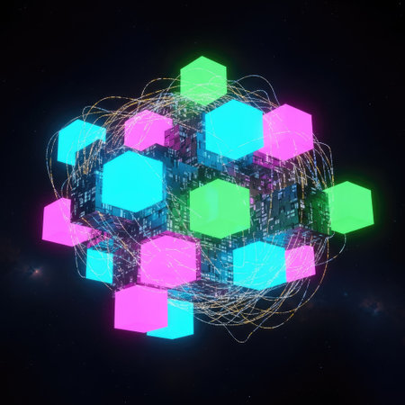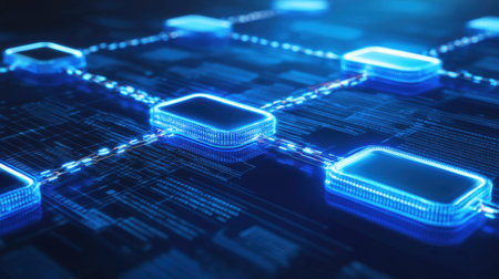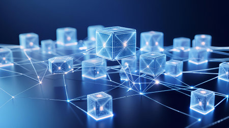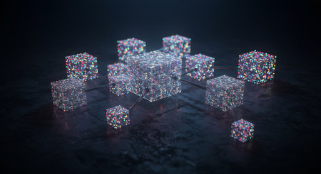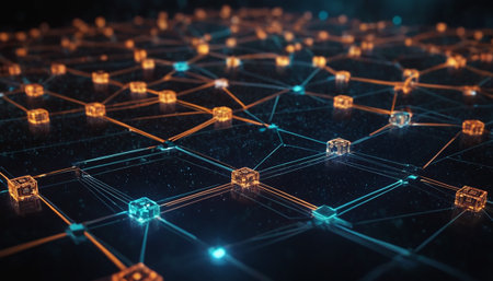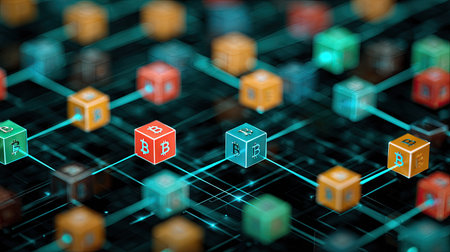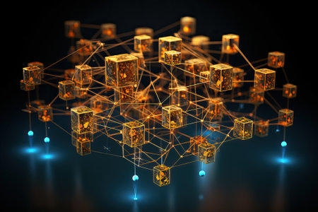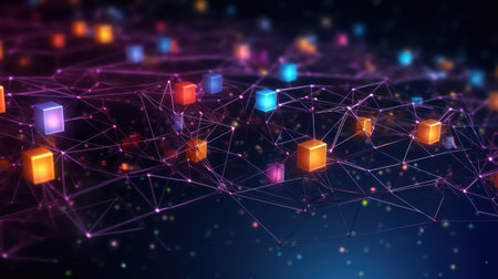 A network of interconnected blocks and lights depicting cryptocurrency blockchain data on a dark background - 3D render