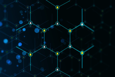 Creative glowing hexagonal pattern with tiny padlocks on blurry background. Digital security and firewall concept. 3D Rendering