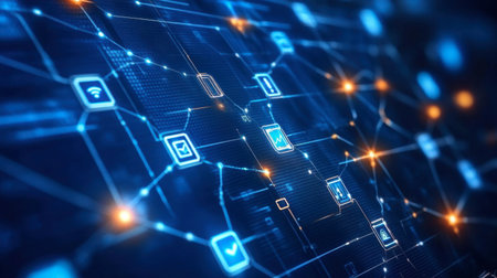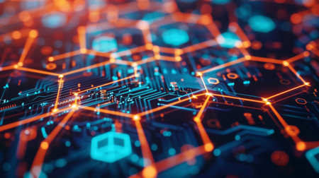 Visualizing network connecting hexagonal and circular nodes with icons, lines in digital interface. Technology, connectivity, cyber, modern, interface, digital, futuristic