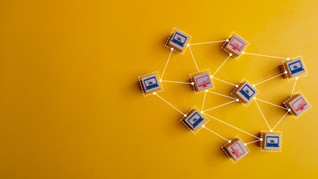 Wooden cubes with computer and laptop icons connected to each other on a network on a yellow background. Concept of computer network or communication.