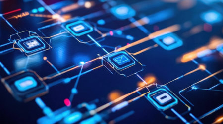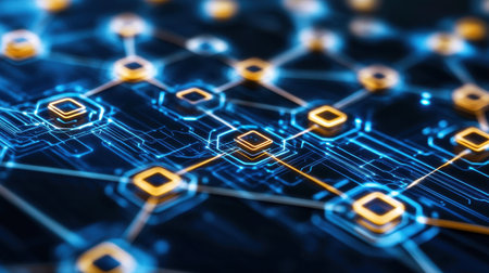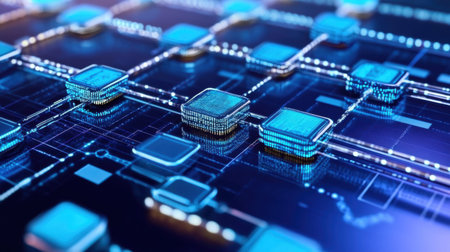 Blockchain technology and network concept. Block chain text and icon network connection on motherboard microcircuit fast speed background