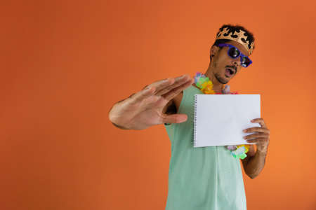 Black man in costume for brazil carnival holding blank paper isolated on orange background. African man in various poses and expressions.