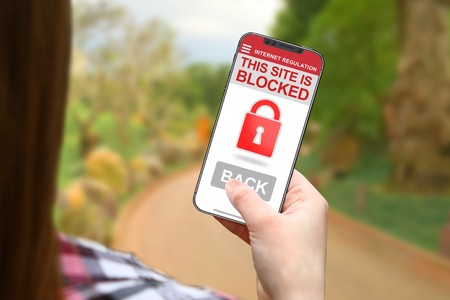 Site blocked concept, girl with frameless phone on blurred nature background