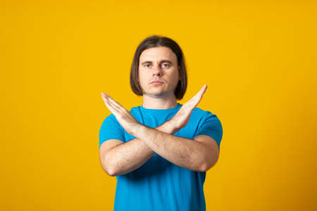 No way, absolutely not! Portrait of determined man in blue t-shirt showing x sign with crossed hands, meaning stop, this is the end, on yellow background.