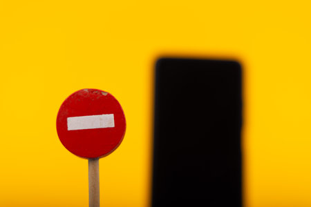 A wooden toy No Entry sign is prominently displayed with a blurred smartphone in the background against a vibrant yellow backdrop, creating a conceptual image