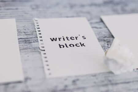 creative block or lack of inspiration conceptual still-life, piece of paper on wooden desk with Writer's Block text surrounded by blank notepads and with scrunched paper ball next to it