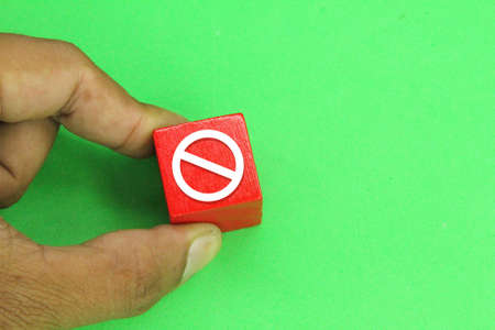 a hand holding a red cube with a prohibition sign or a forbidden sign