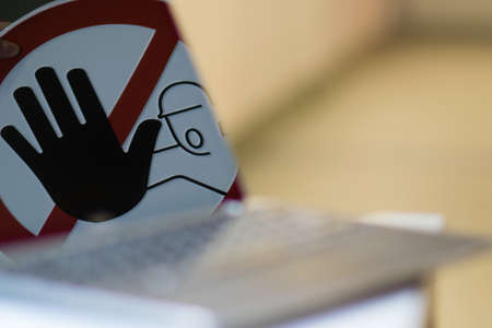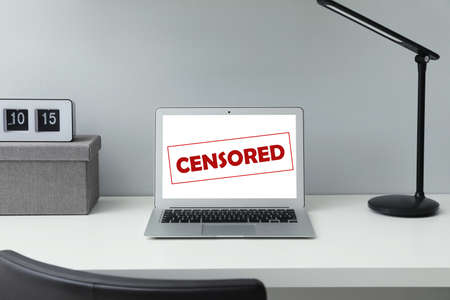 Laptop with censorship sign on white table