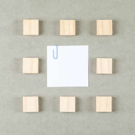 Business concept with clipped sticky note, wooden blocks on grey background flat lay.