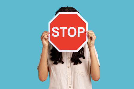 Unknown woman with black dreadlocks hiding her face behind red stop traffic symbol, warning, avoids forbidden actions, wearing white shirt. Indoor studio shot isolated on blue background.
