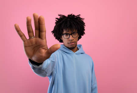 Serious African American teen guy gesturing STOP on pink studio background. Negative opinion concept