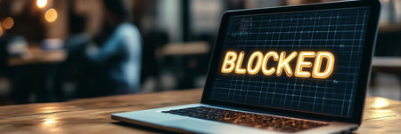 Laptop With Neon Text Blocked Displayed on Screen, Cybersecurity and Content Restriction Concept