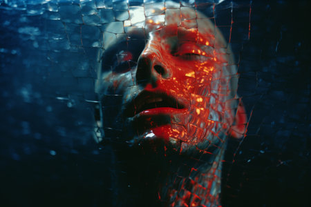 Young woman with face pieces detached, symbolizing prosopagnosia or face blindness diagnosis, portraying distorted memory and identity.