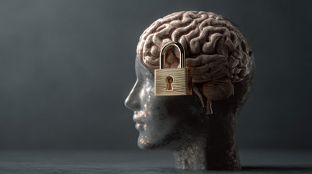 Silhouette of a head with a lock, lockout from computer cloud, safety concept, mental health, protection of thoughts and privacy
