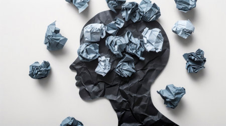 A dark silhouette of a human head and shoulders is surrounded by several crumpled paper balls. The high-angle shot presents a contrast between the dark figure and the bright, textured paper. The composition evokes thought and pressure. Suitable for illustrating ideas, concepts, and challenges.