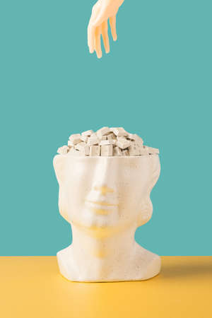 Open your mind, mental health concept, creative thinking. Paper silhouette of human head and pills on yellow background