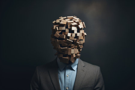A portrayal of internal struggles, a man with puzzle pieces instead of a head against a dark backdrop. Inner thoughts and confusion