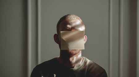 Man with adhesive tape on his face covering his mouth and looking away