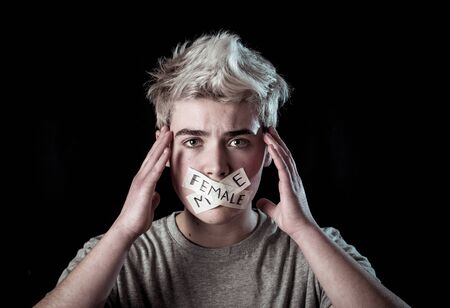 Transgender teenager with mouth sealed on tape with words male and female written in social taboo of gender diversity concept. Trans boy not able to communicate or be free to express his own identity.