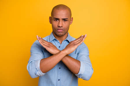 No way, absolutely not! Portrait of determined man in blue t-shirt showing x sign with crossed hands, meaning stop, this is the end, on yellow background.
