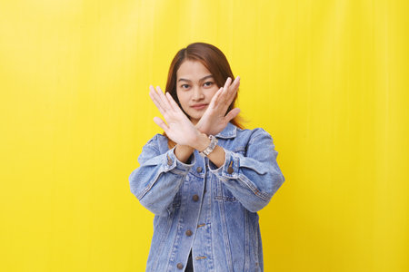 Beautiful young brunette woman in jeans jacket making stop gesture on the street