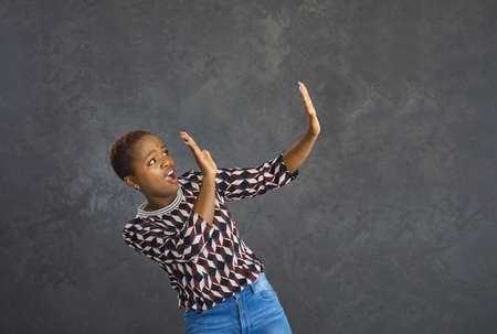 African American young woman show stop or no hand gesture or sign protest against racial or gender discrimination. Biracial female demonstrate object against domestic violence or abortion.