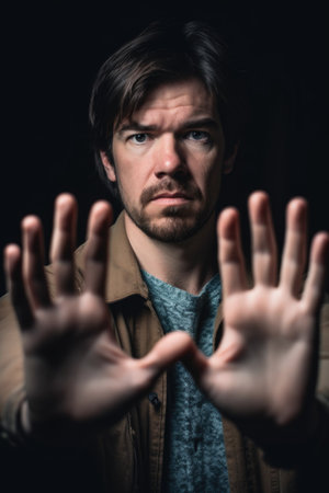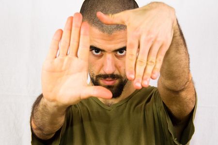 A man with a beard extends his hand towards the camera against a plain white background, creating a sense of stopping or blocking.