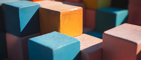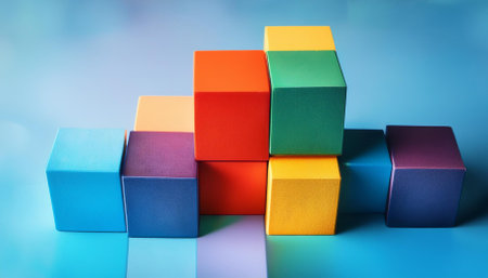 A modern abstract design of scattered colorful cubes on a soft white surface, with gentle light emphasizing the different textures of each cube.