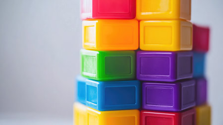 A stack of colorful plastic building blocks on a white background, representing creativity, play, and childhood.