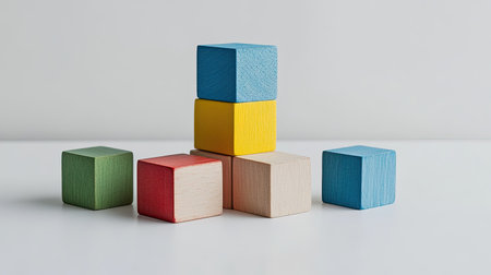 A simple geometric arrangement of colorful blocks on a clean, white surface