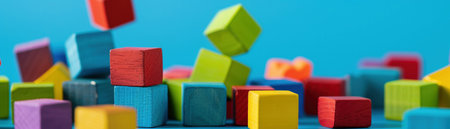 Vibrant image of colorful wooden blocks scattered on a blue background, creating a playful and artistic composition perfect for children's toys and educational themes.
