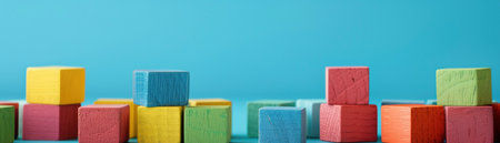 Colorful wooden blocks stacked on a vibrant blue background, showcasing creativity and playfulness, ideal for children s education and development