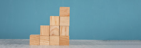 wooden block stacking as step stair on blue background. Business concept for growth success process.