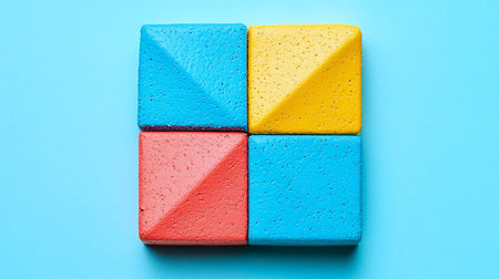Four square blocks, each with a textured surface, arranged in a 2x2 grid. The blocks are colored blue, yellow, and red.