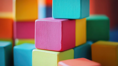 Brightly colored wooden blocks are stacked in a playful arrangement. The vibrant hues of pink green and yellow enhance creativity and fun.