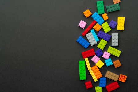 toy blocks, multicolor wooden puzzles. Flat lay and place for text.