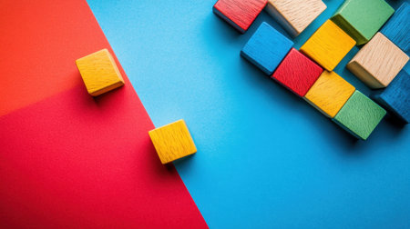 A vibrant collection of wooden blocks in various colors is neatly arranged on a bright blue and red background, perfect for educational toys and creative projects.