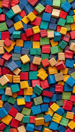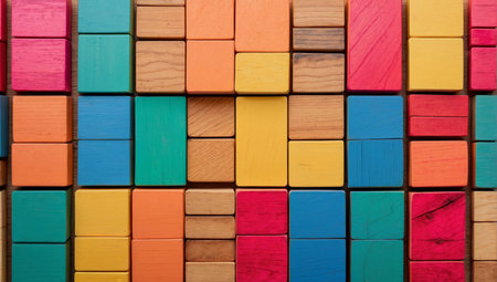 Vibrant wooden blocks meticulously arranged in a colorful pattern.